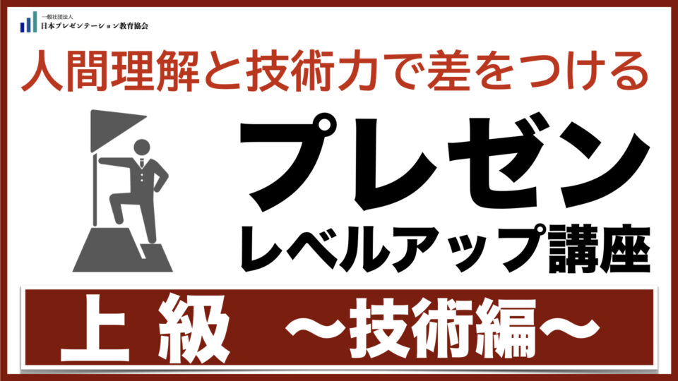 3級、準2級の内容に加え、極めて高度なプレゼンテーション技能を有し、企画提案や商談、製品説明会などの様々なビジネスプレゼンを実施できる能力を有している【試験方式:オンライン記述式、会場/オンラインでの実技】